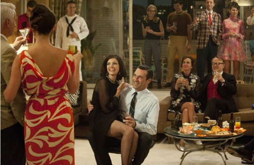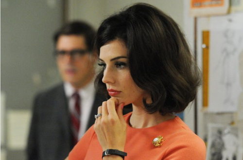 Megan is still the same freedom-loving French Canadian lady with manners, which were in the style of swinging late 60s. Megan in the new episodes of Mad Man wears a short dress of silk jersey geometric print, large gold-plated jewelry, shoes with low heels and strong eye makeup. In her grand entrance at the party in honor of the Don’s birthday she wears a black mini-dress with wide sleeves trimmed with crystals.