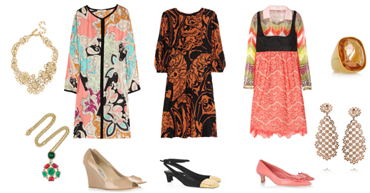 On the photo: Necklace from Oscar de la Renta, pendant from Kenneth Jay Lane., Tunic by Etro, shoes from Jimmy Choo, dress from Gucci, shoes from Yves Saint Laurent, Dress by Carven, shoes from Miu Miu, ring by Kenneth Jay Lane, earrings by Laurent Gandini.