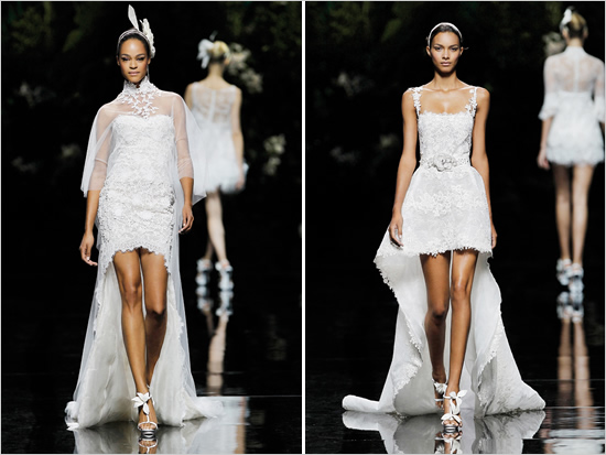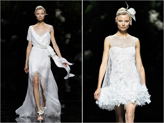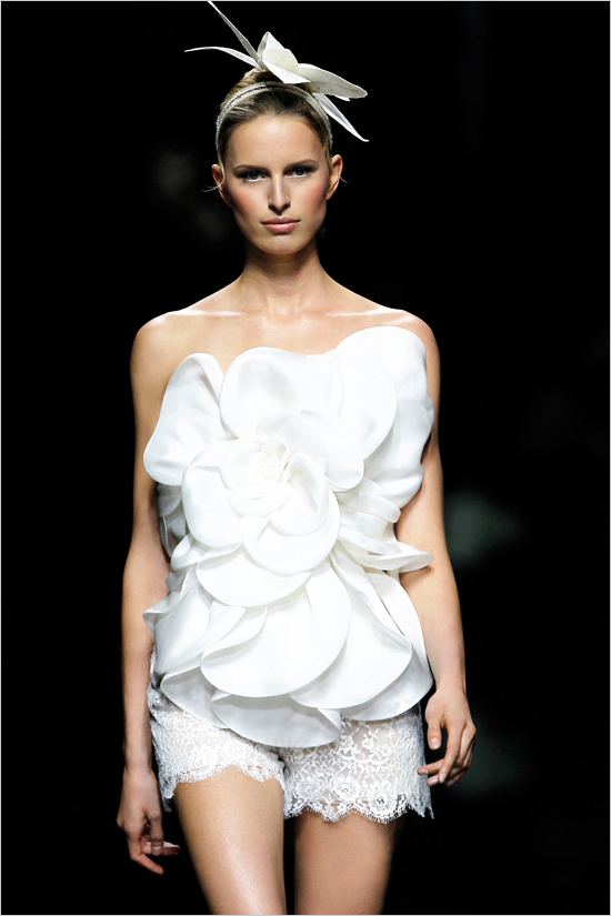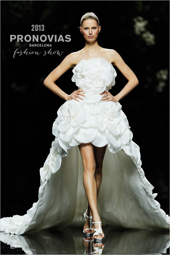 On this magical wedding dresses collection show Pronovias 2013 was shown about 80 dresses all together. The explicit emphasis on wedding fashion was made by flower theme (it becomes clearly in favor), but also many wedding dresses had particularly romantic feel, bordering with contemporary skirt cut and length.
